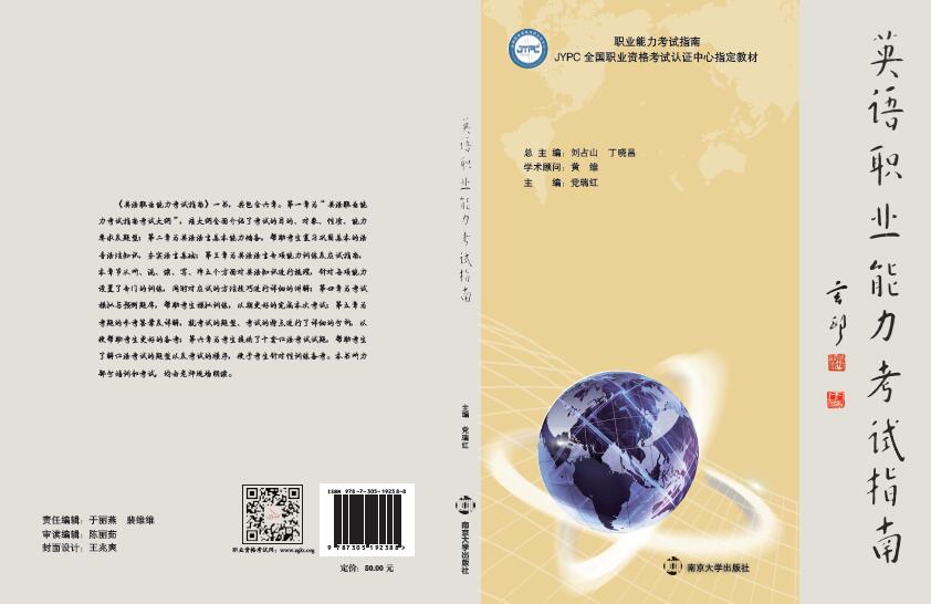《英语职业能力考试指南》一书,共包含六章。第一章为“英语职业能力考试指南考试大纲”,该大纲全面介绍了考试的目的、对象、性质、能力要求及题型;第二章为英语语言基本能力储备,帮助考生复习巩固基本的语音语法知识,夯实语言基础;第三章为英语语言专项能力训练及应试指南,本章节从听、说、读、写、译五个方面对英语知识进行梳理,针对每项能力设置了专门的训练,同时对应试的方法技巧进行详细的讲解;第四章为考试模拟与预测题库,帮助考生模拟训练,以期更好的完成本次考试;第五章为考题的参考答案及详解,就考试的题型、考试的特点进行了详细的分析,以便帮助考生更好的备考;第六章为考生提供了十套口语考试试题,帮助考生了解口语考试的题型以及考试的顺序,便于考生针对性训练备考。