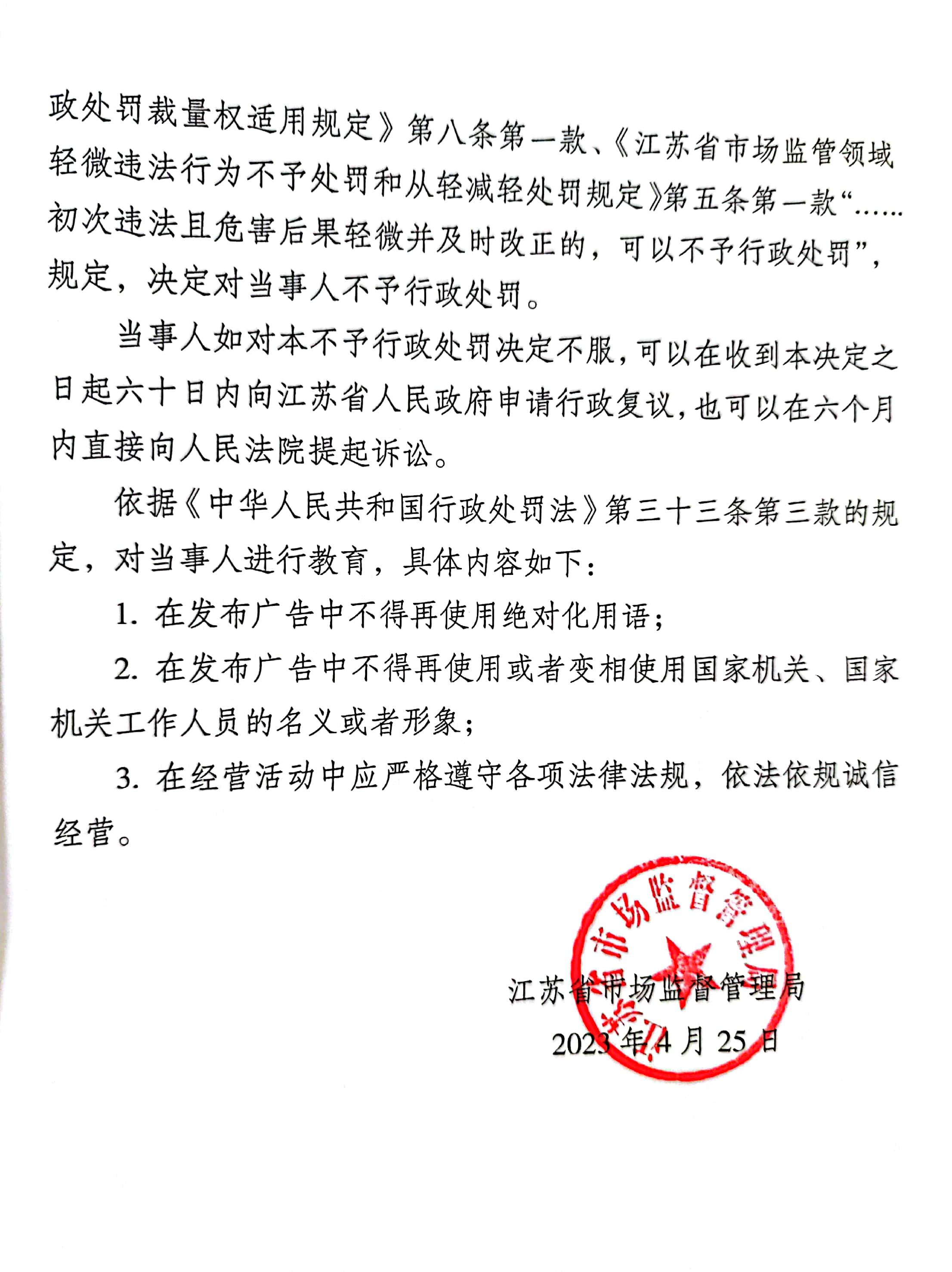 《不予行政处罚决定书》认定JYPC存在2项违反《广告法》第九条的行为:一是使用绝对化用语“创办最早”“规模最大”,二是在宣传介绍时使用教育部新闻发布会照片。经江苏省人社厅现场督查,属于初次违法且及时改正,造成的危害后果较轻,决定对当事人不予行政处罚。