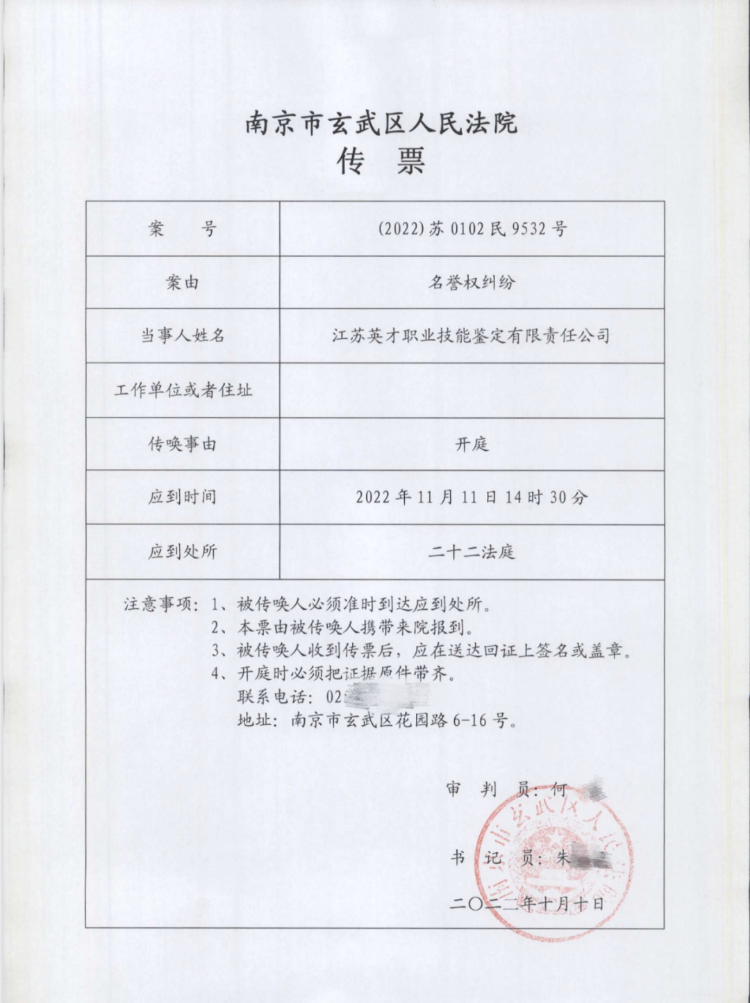 南京市玄武区人民法院开庭传票